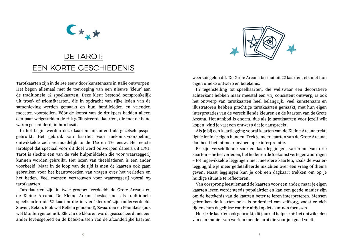 Dit prachtige dagboek staat vol informatie over verschillende leggingen en hoe je de tarotkaarten kunt lezen. Er is volop ruimte om te noteren welke boodschap ze voor je hebben. Dit journal bevat alles wat je nodig hebt op weg naar je ware ik! Luxe uitgave met gouden foliedruk op het omslag.
