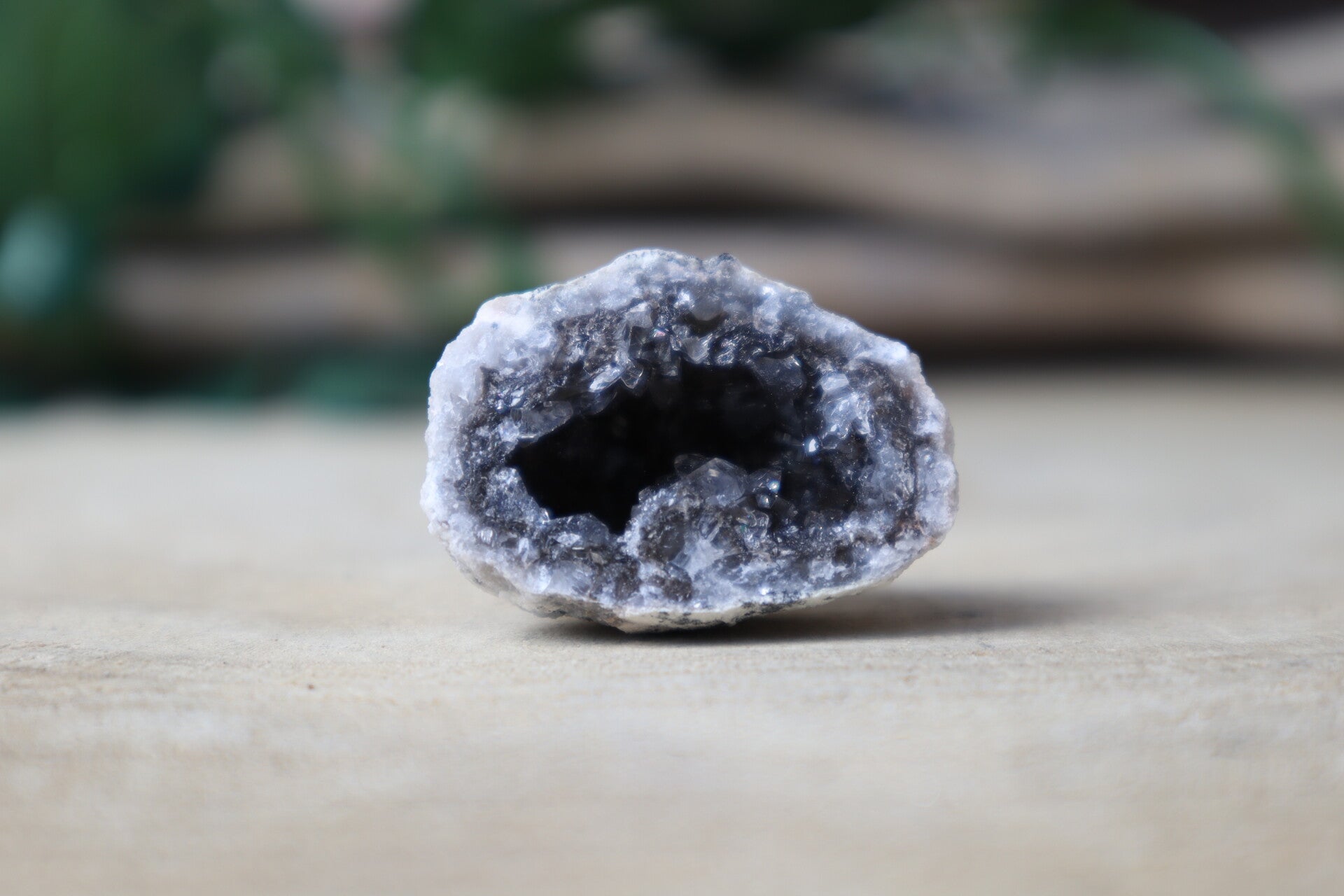 Chalcedoon geode. Prachtige donkere kristallen.