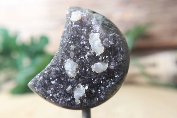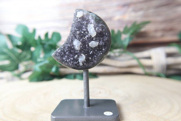 Druzy Amethist maan met jaspis en calciet op standaard.
