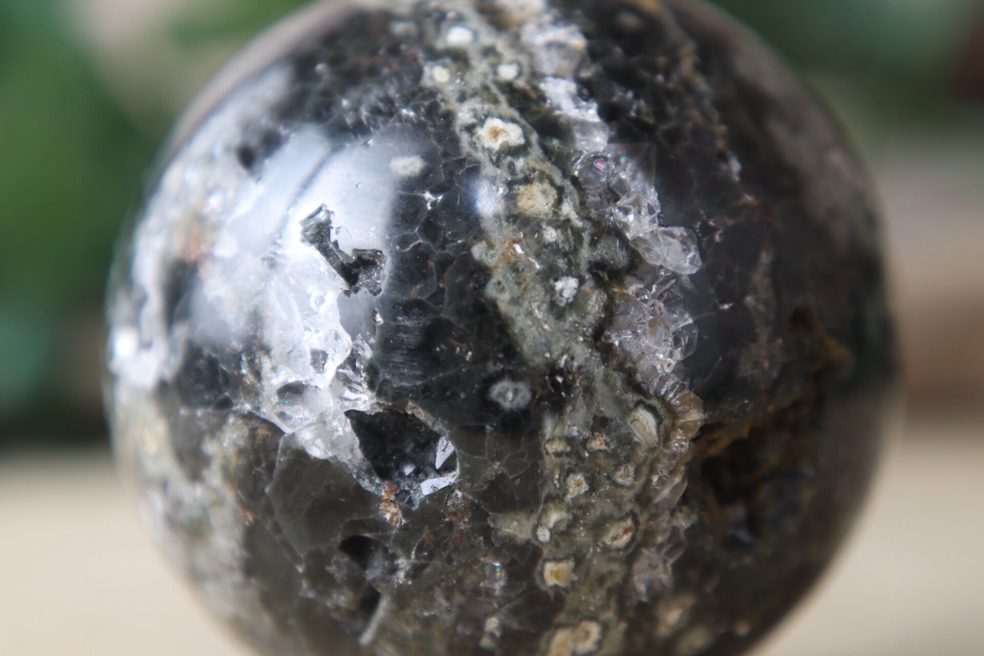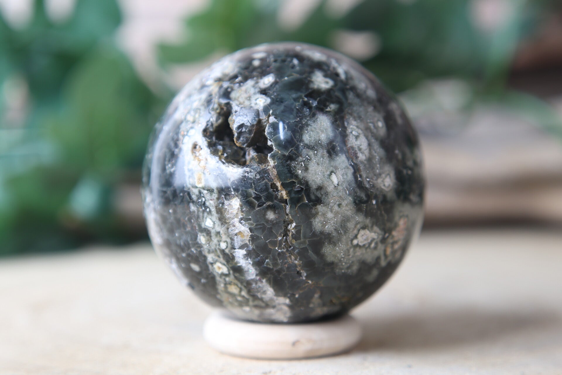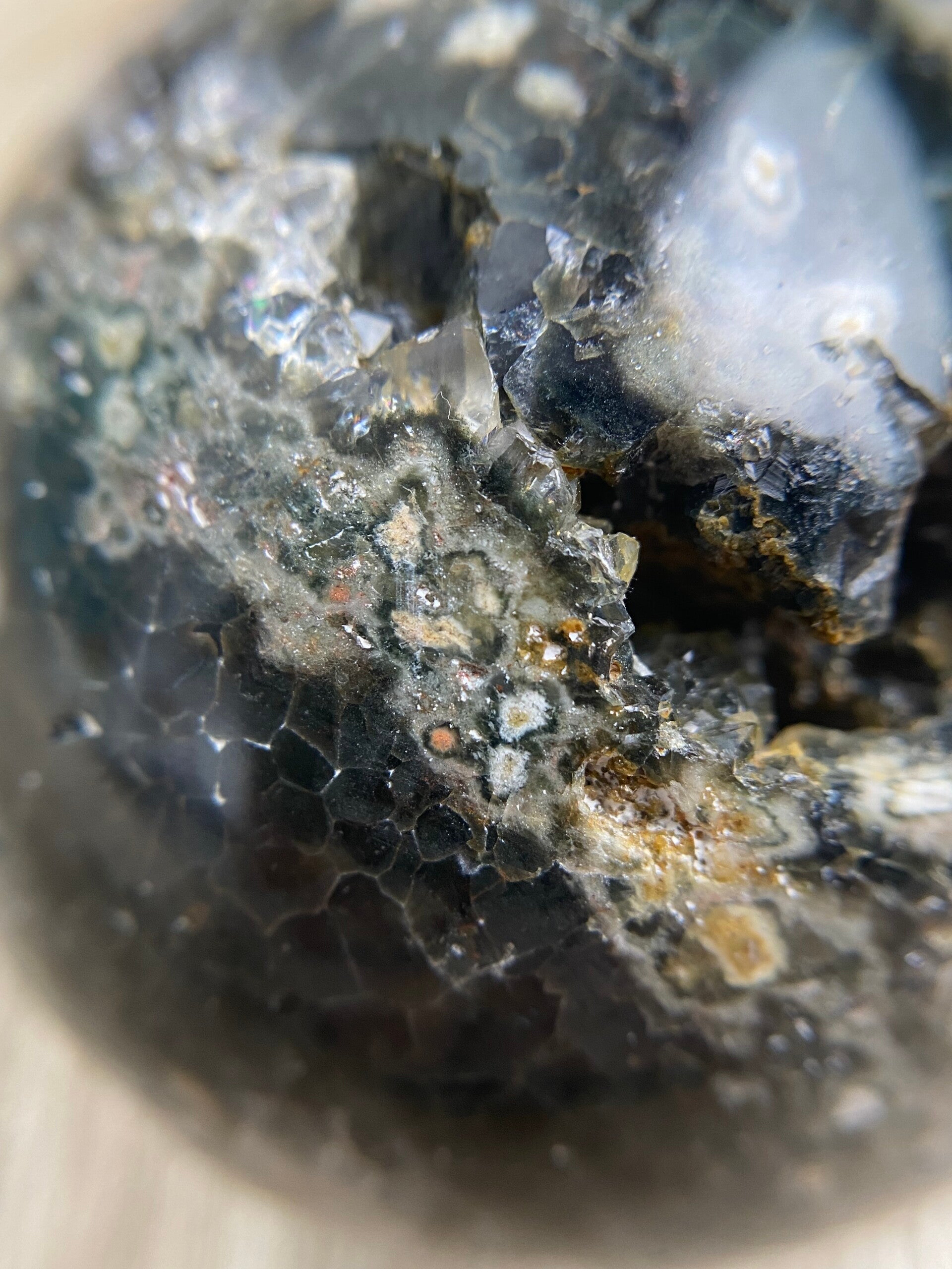 Groene oceaan jaspis bol. Incl gratis houten ring. Met mooie regenboogjes.
