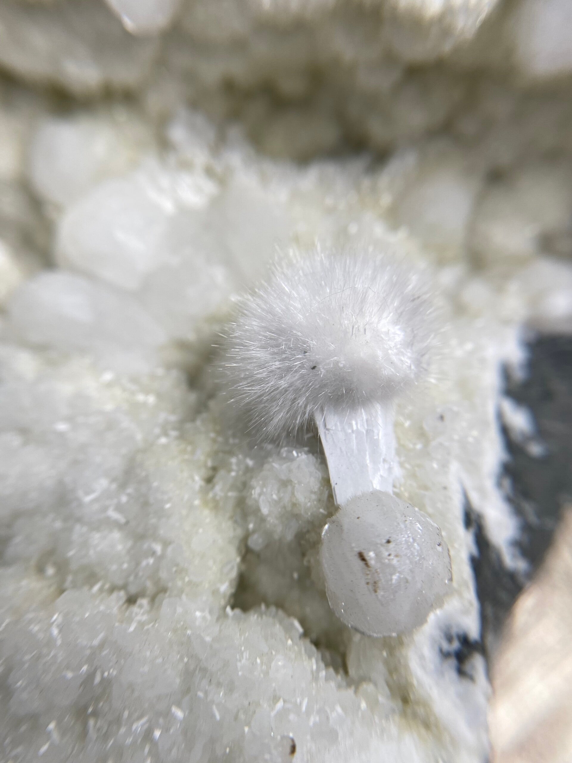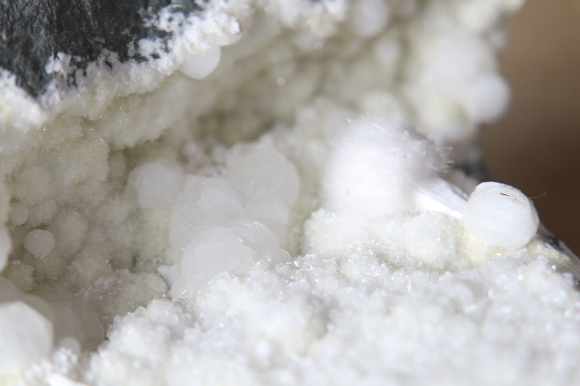 Okeniet staat bekend om zijn witte, haarachtige kristallen die delicate clusters vormen. De clusters doen sterk denken aan wattenbollen van katoen.