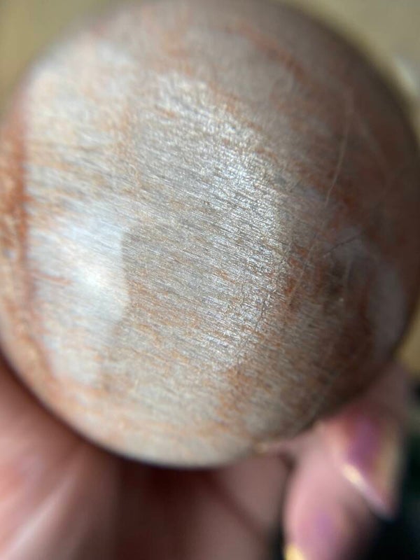 Grote perzik maansteen bol. Incl gratis houten ring. Met mooie flash.