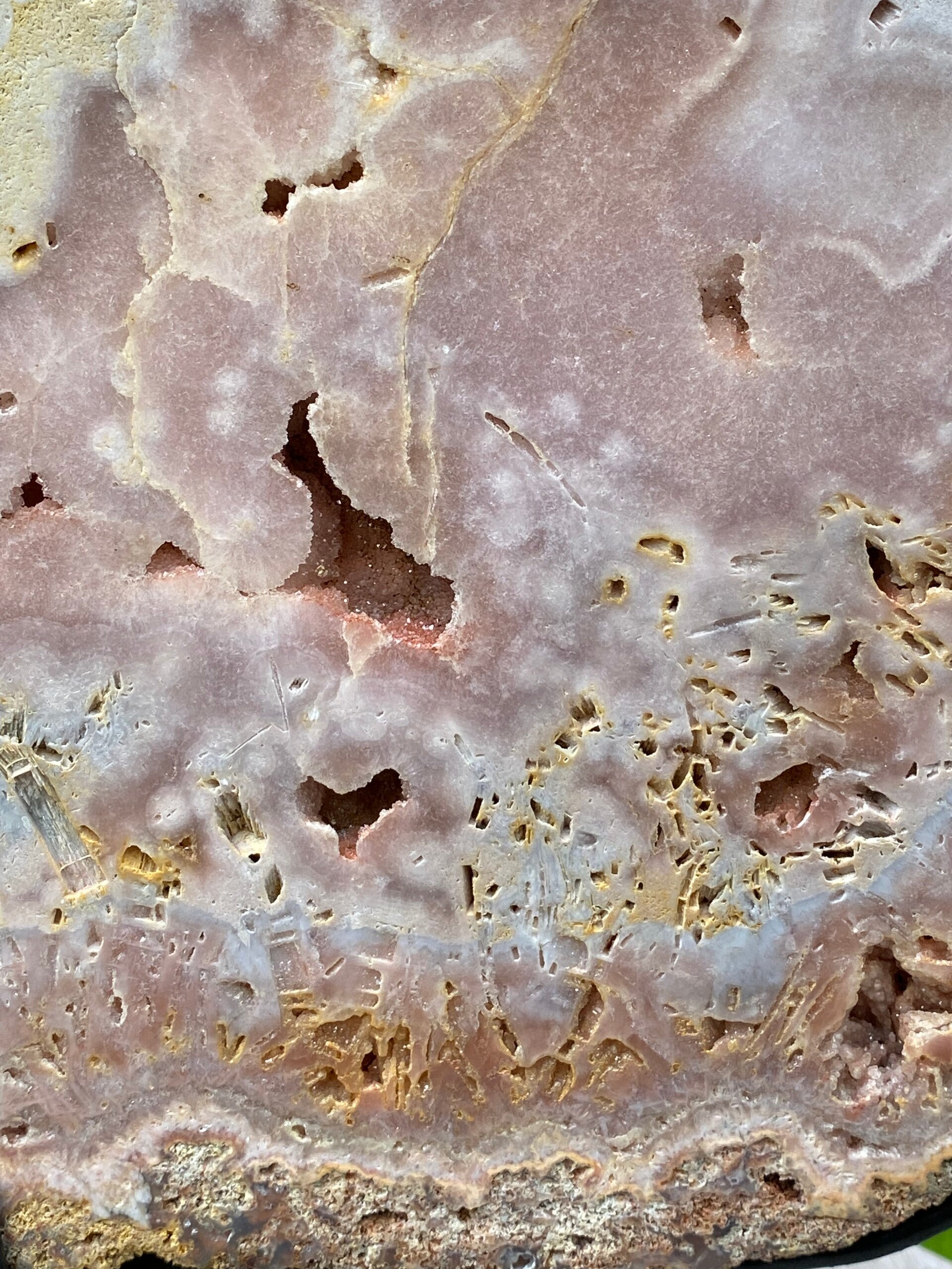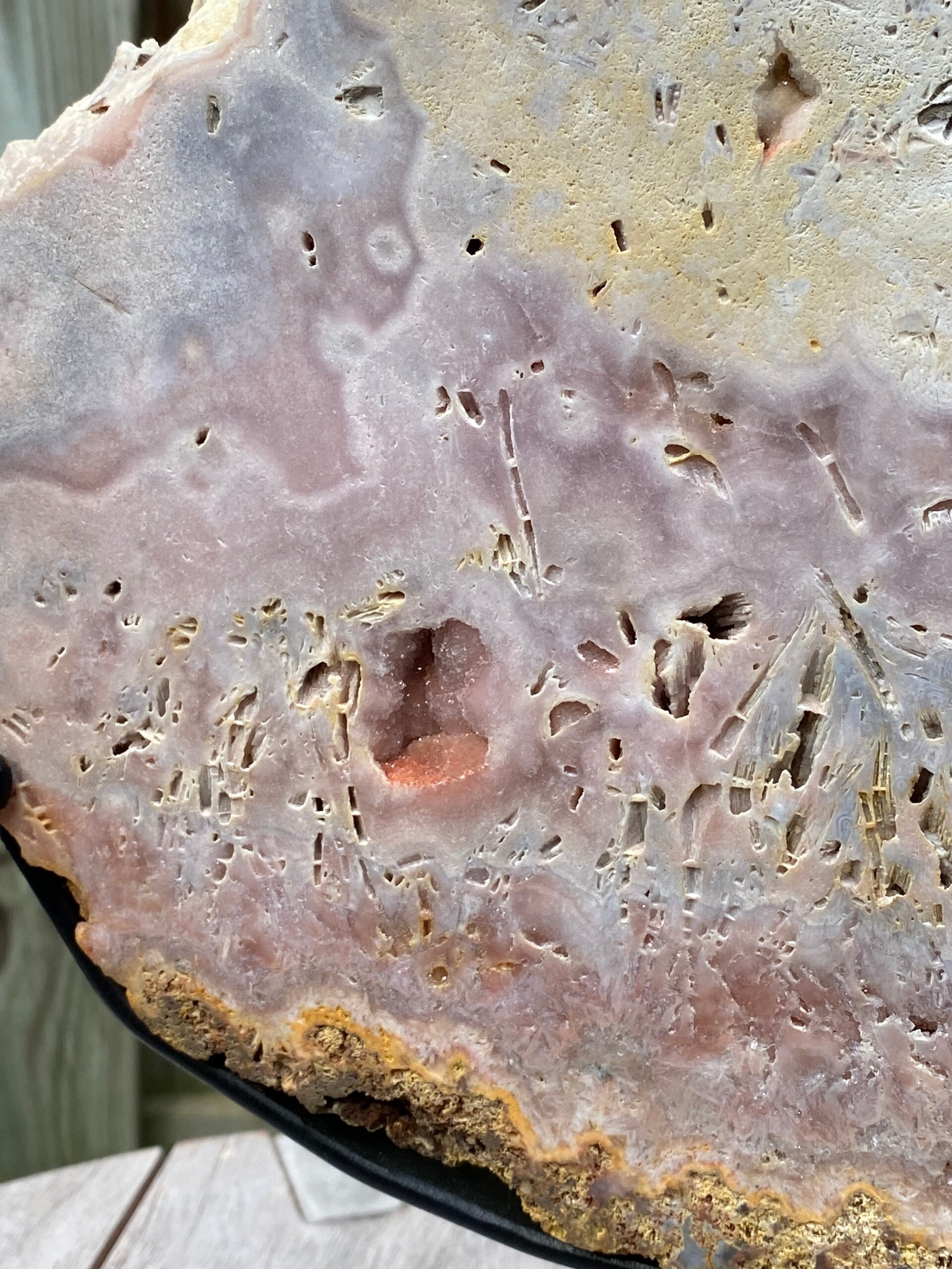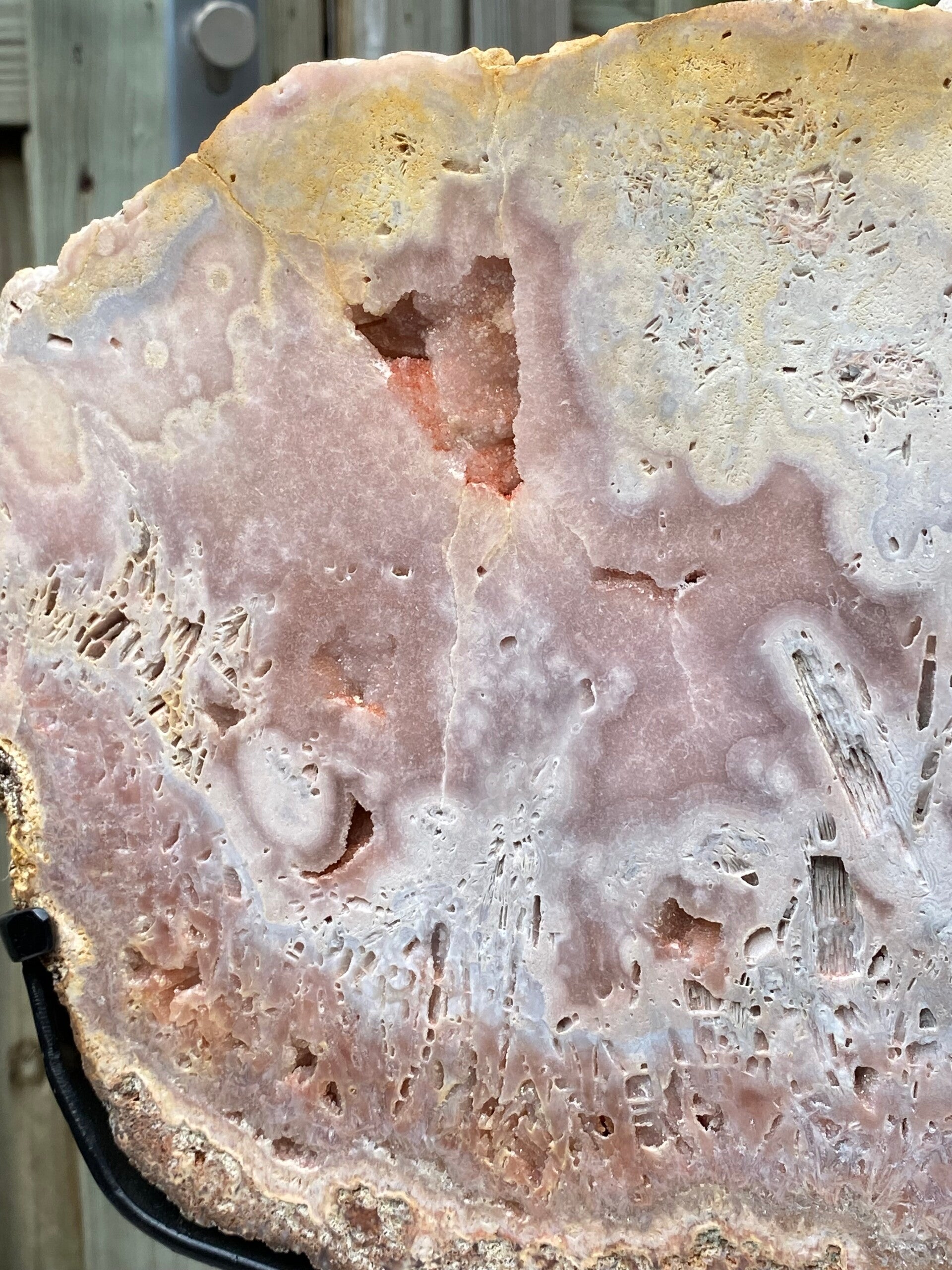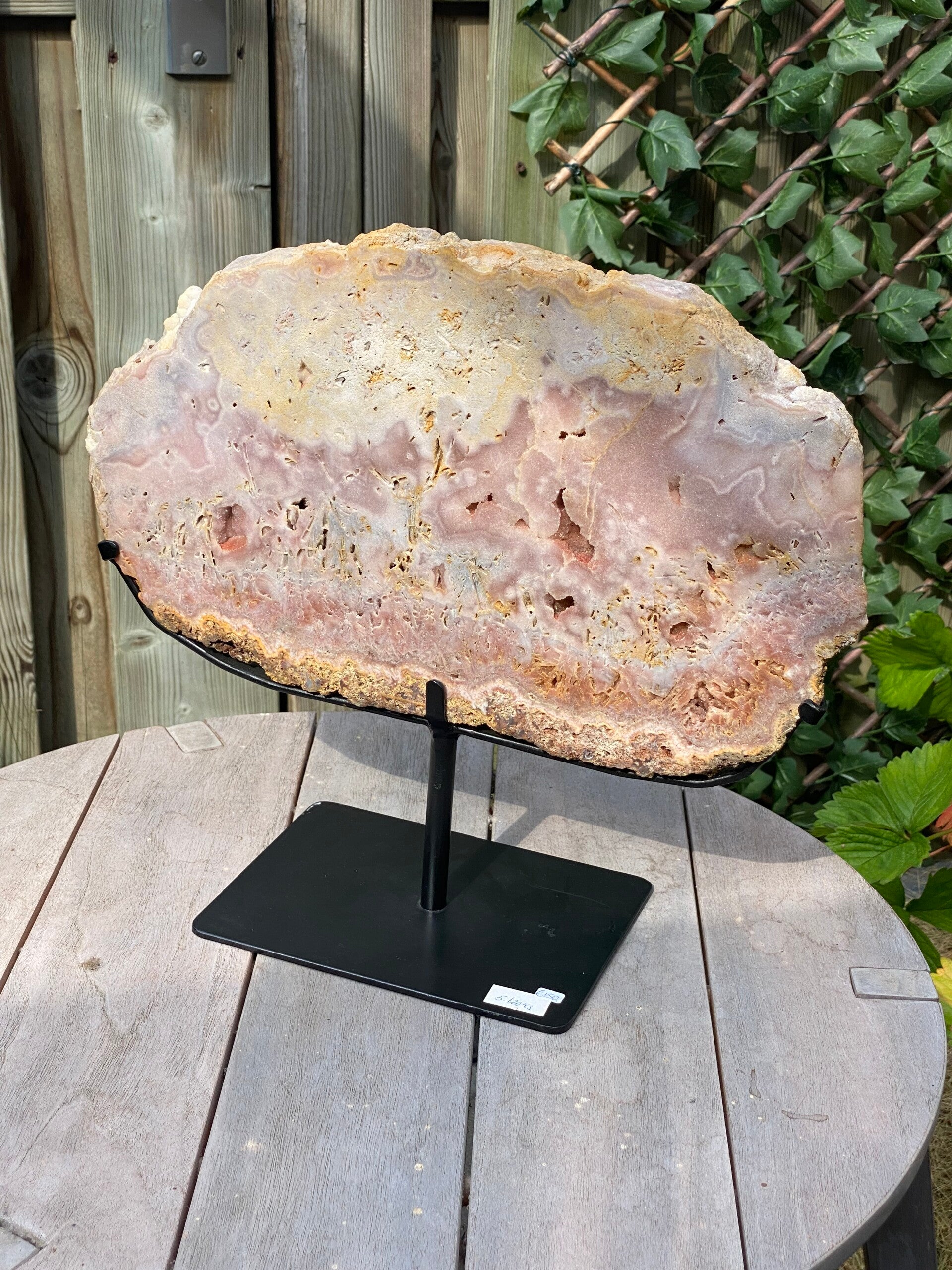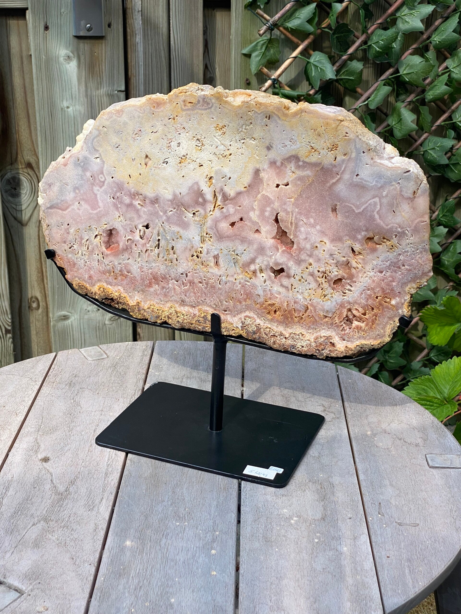 Een mooi groot statement item. Roze amethist plak op standaard. Met diverse druzy pockets.
