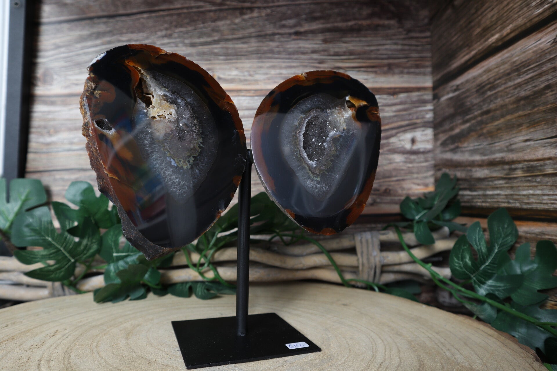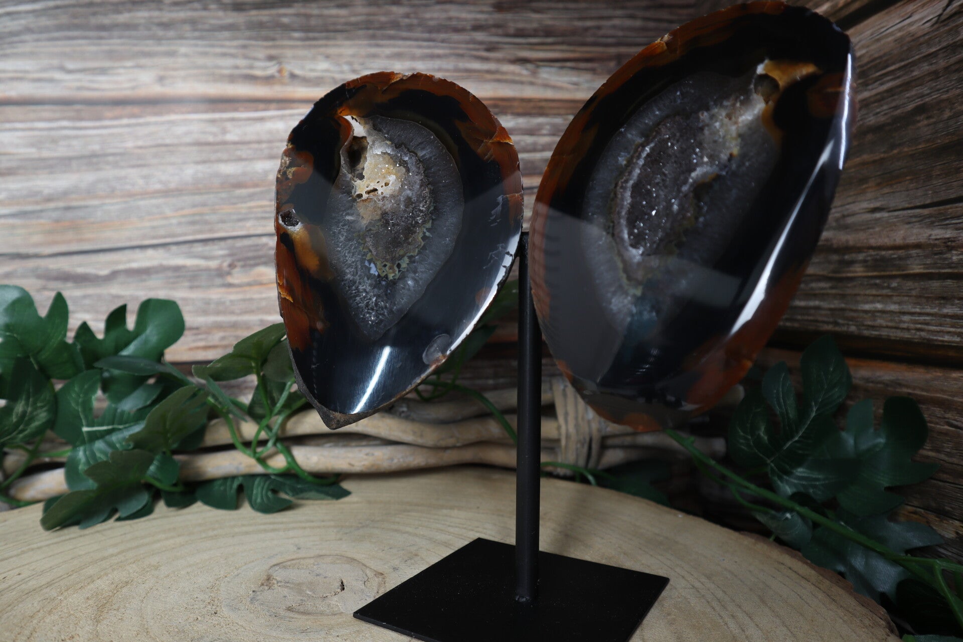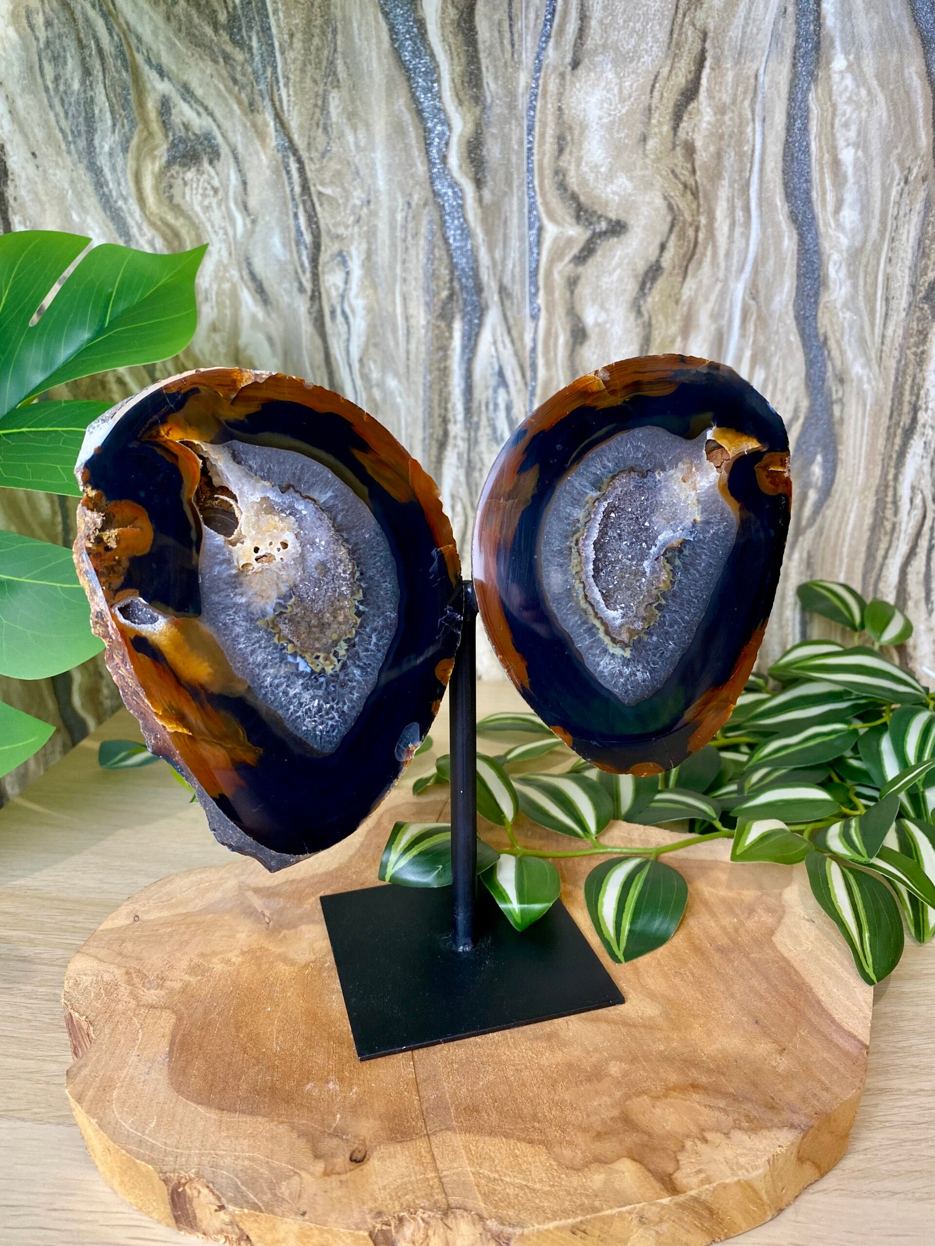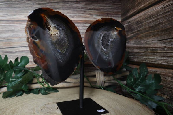 Agaat vlinder op standaard. 2 prachtige stukken agaat geslepen tot vleugels op een metalen zwarte basis zodat het een vlinder lijkt. Met mooie druzy.