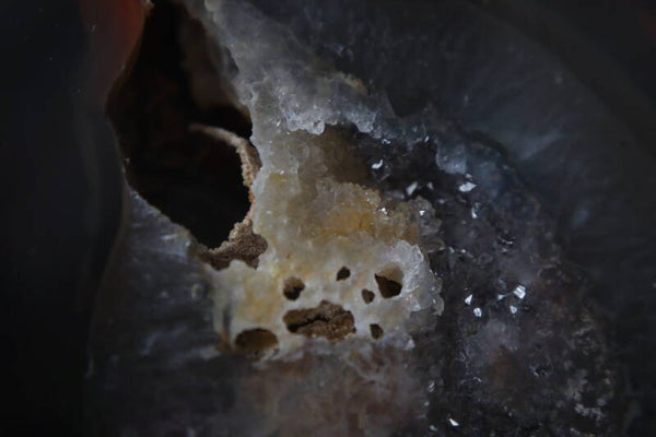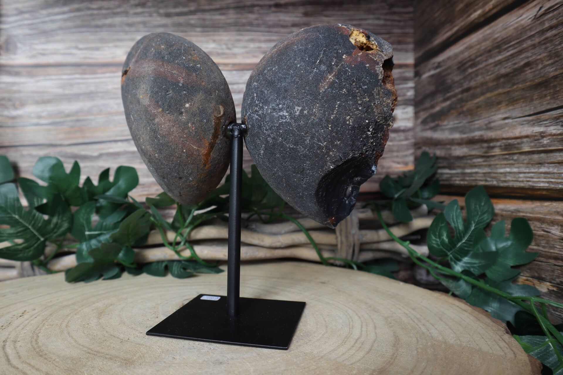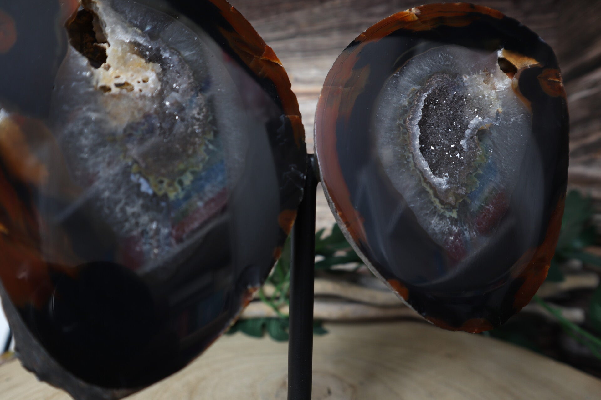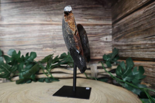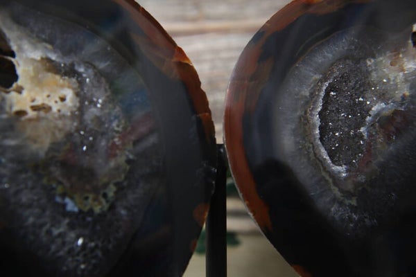 Agaat vlinder op standaard. 2 prachtige stukken agaat geslepen tot vleugels op een metalen zwarte basis zodat het een vlinder lijkt. Met mooie druzy.