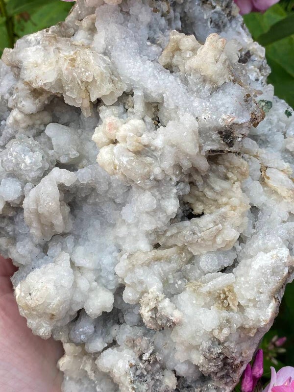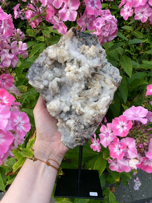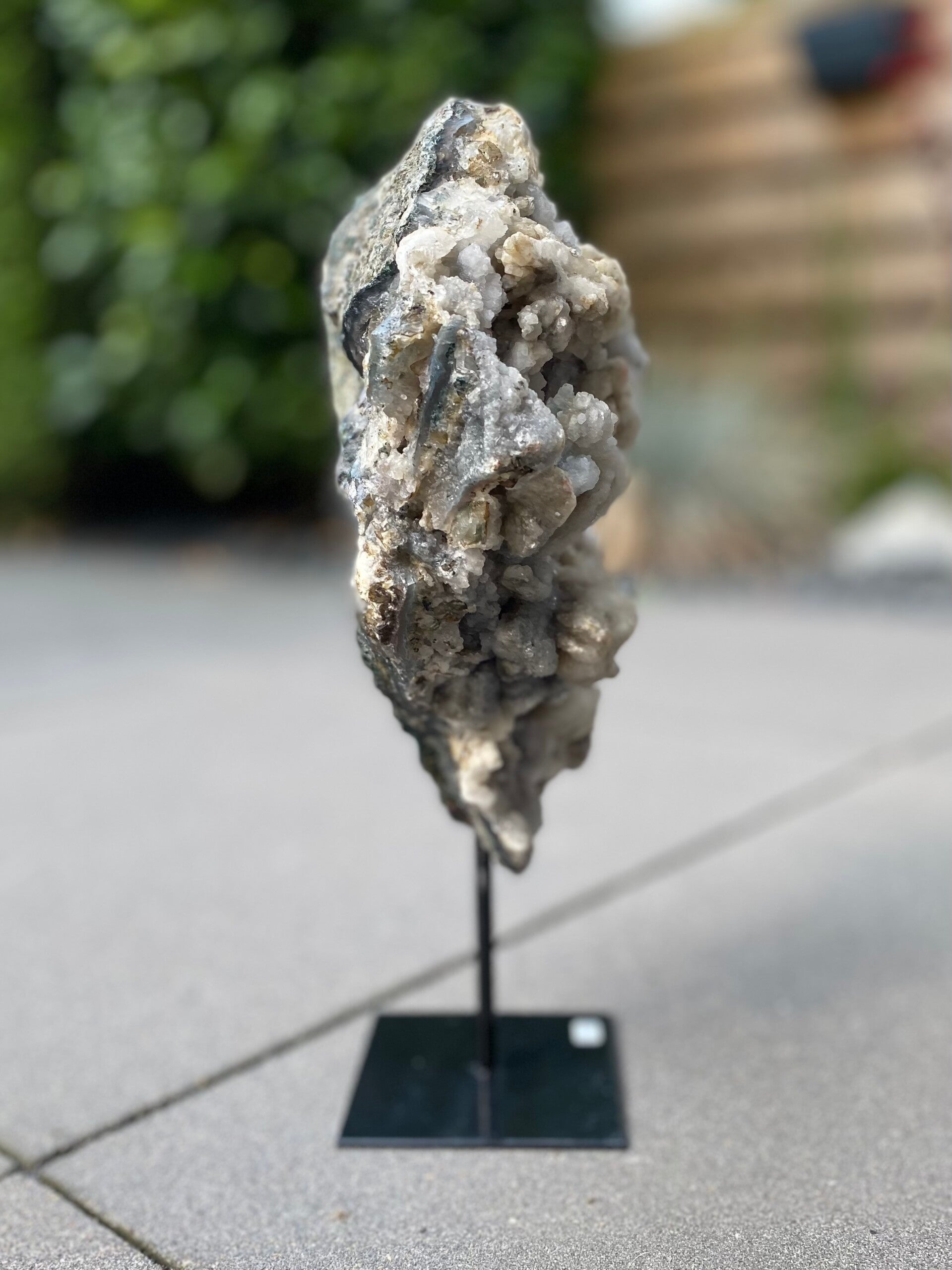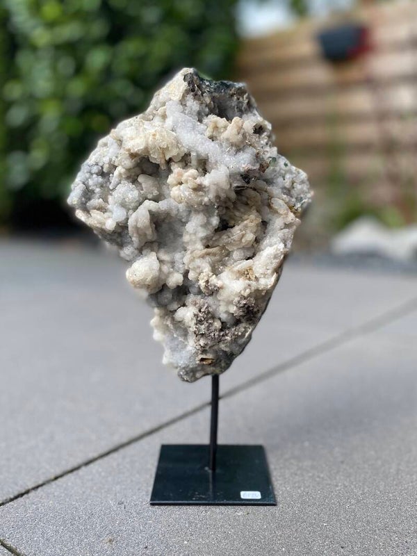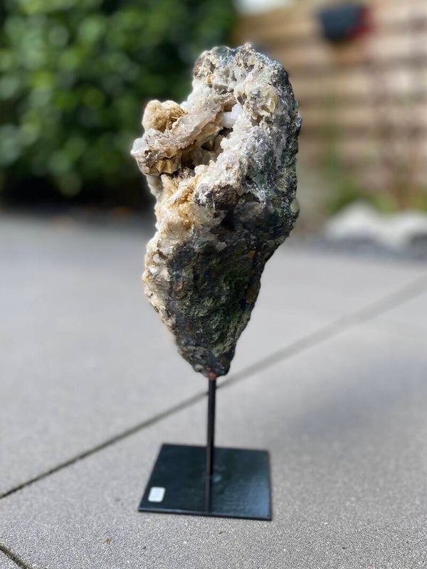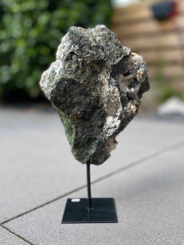 Uniek stuk chalcedoon op zwart metalen standaard.