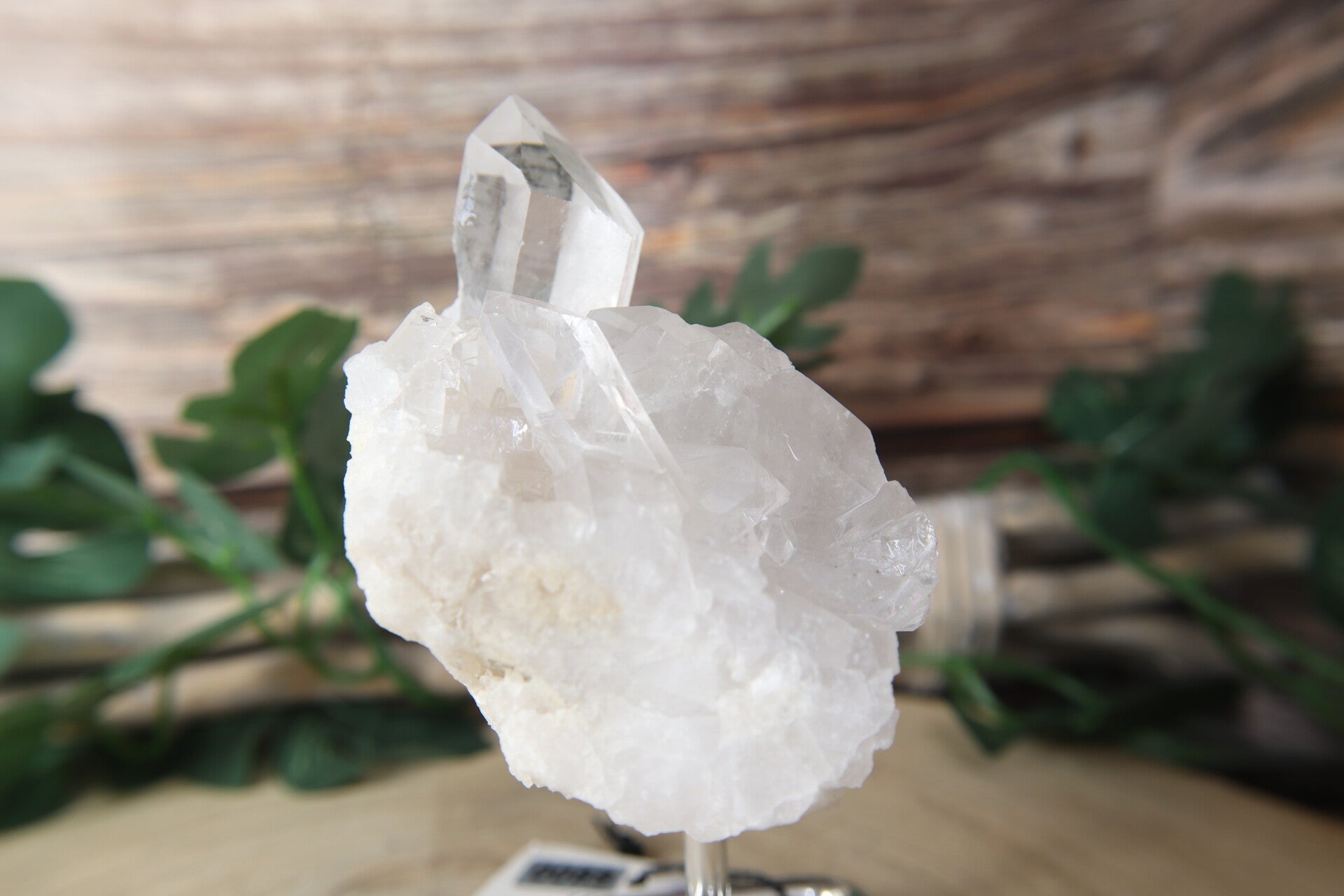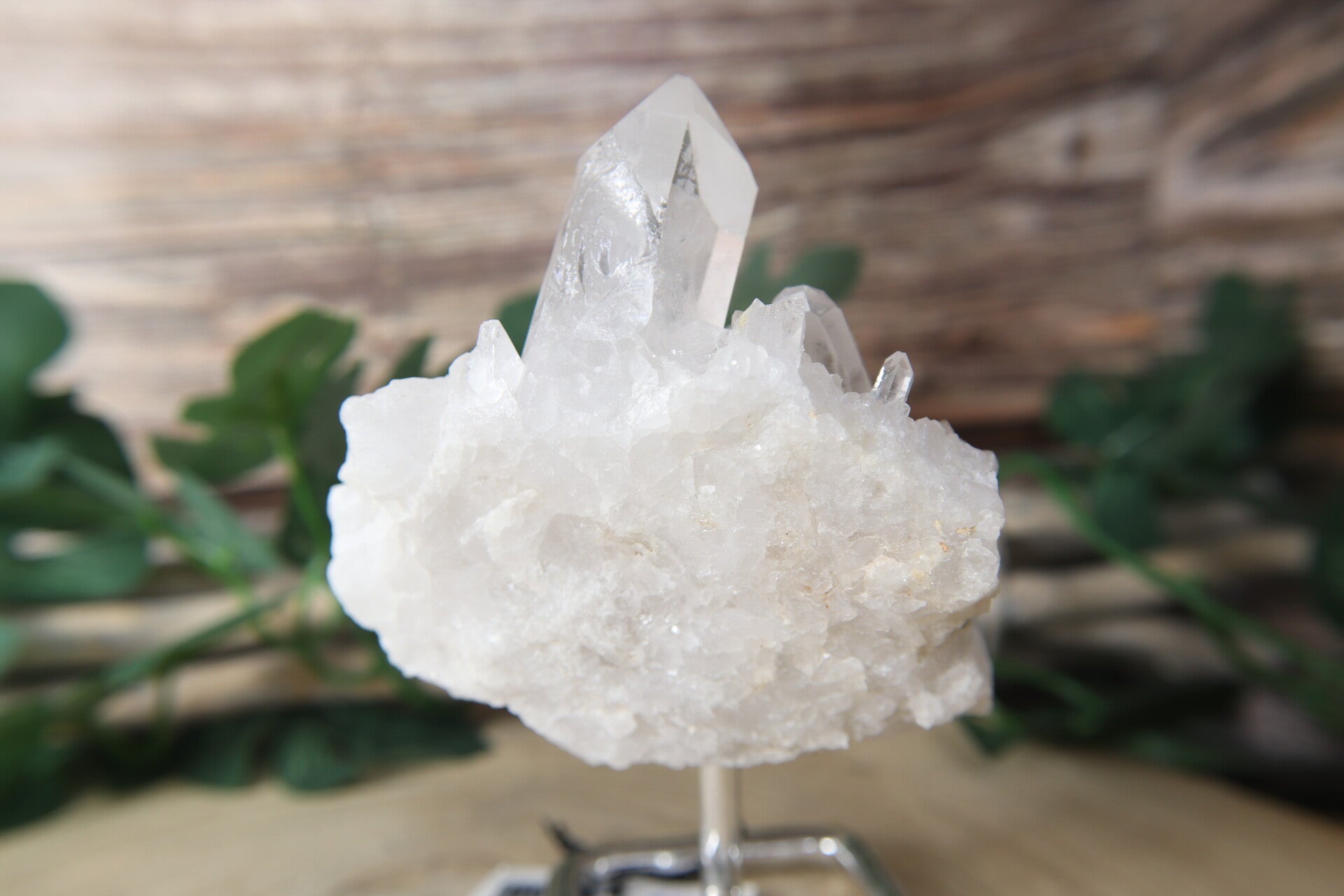 Bergkristal op standaard.De maten zijn +/- 13cm hoog en deze weegt 595gr