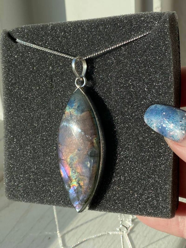 Spectroliet ketting hanger. Prachtige kwaliteit met goede flash. Ingezet in een zilveren houder aan een zilveren ketting. De ketting is 45cm lang. Wordt geleverd in een sieraden doosje met zilver poets doekje.