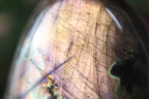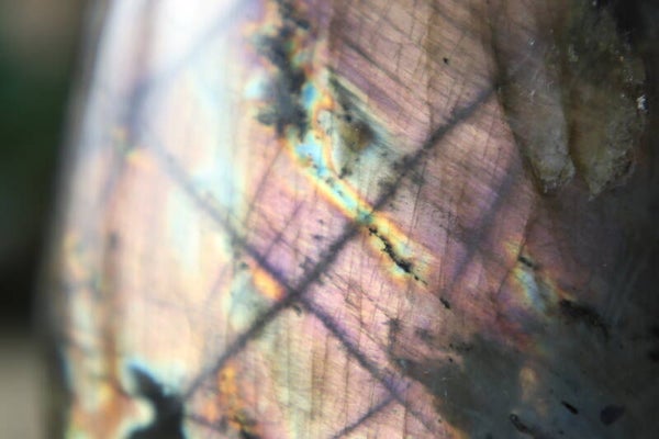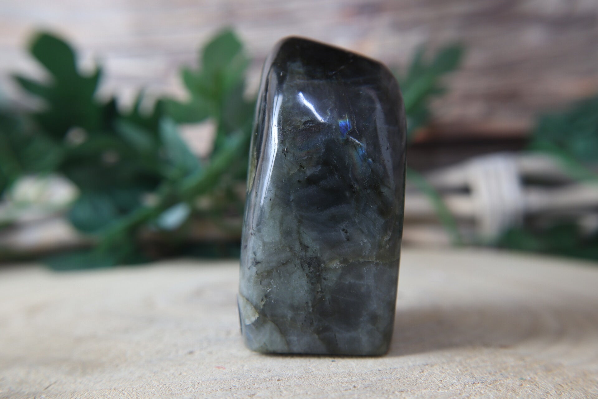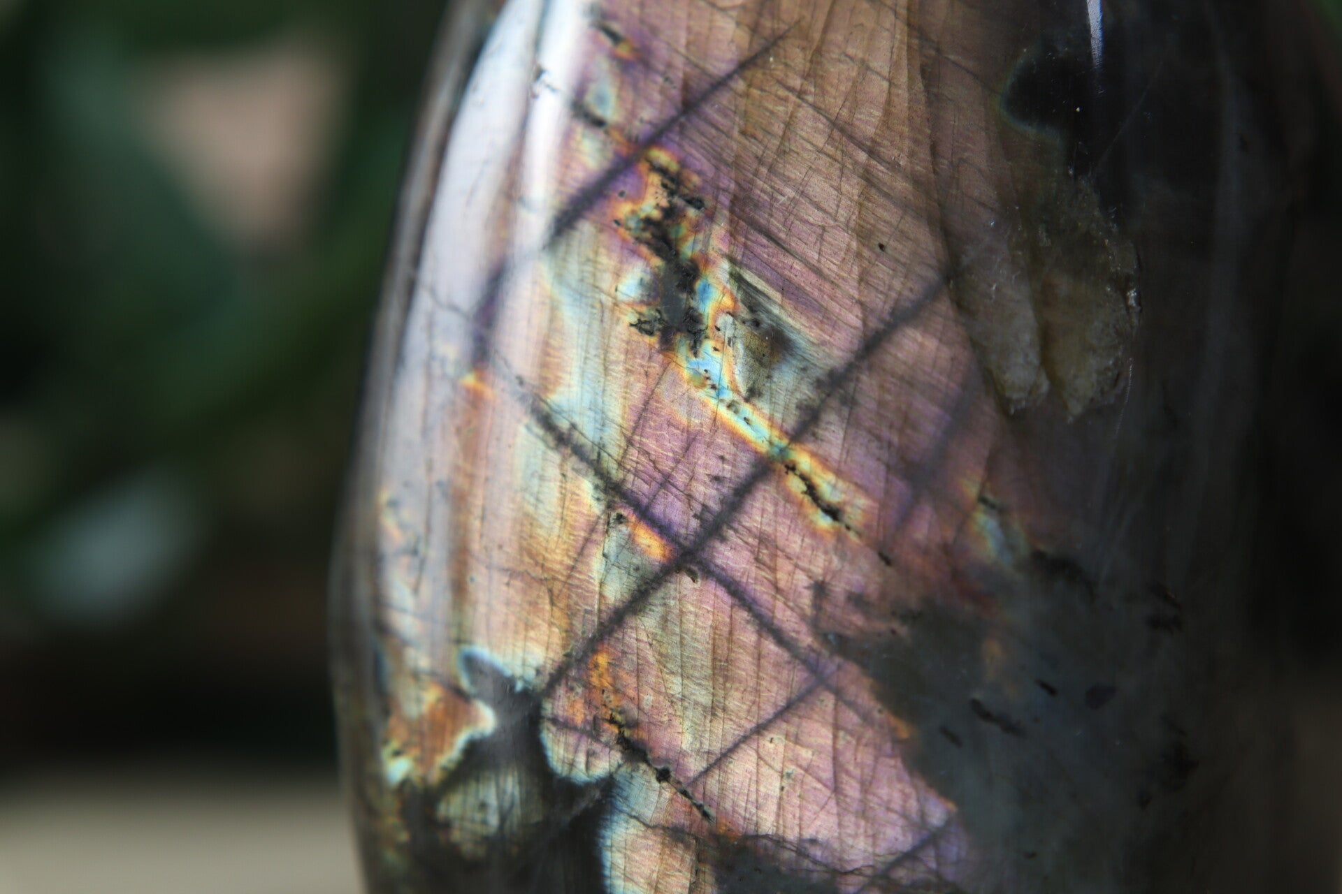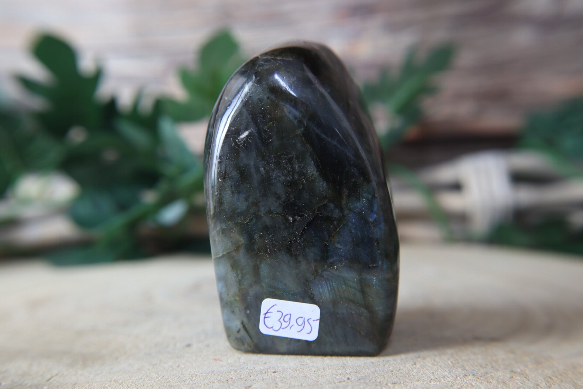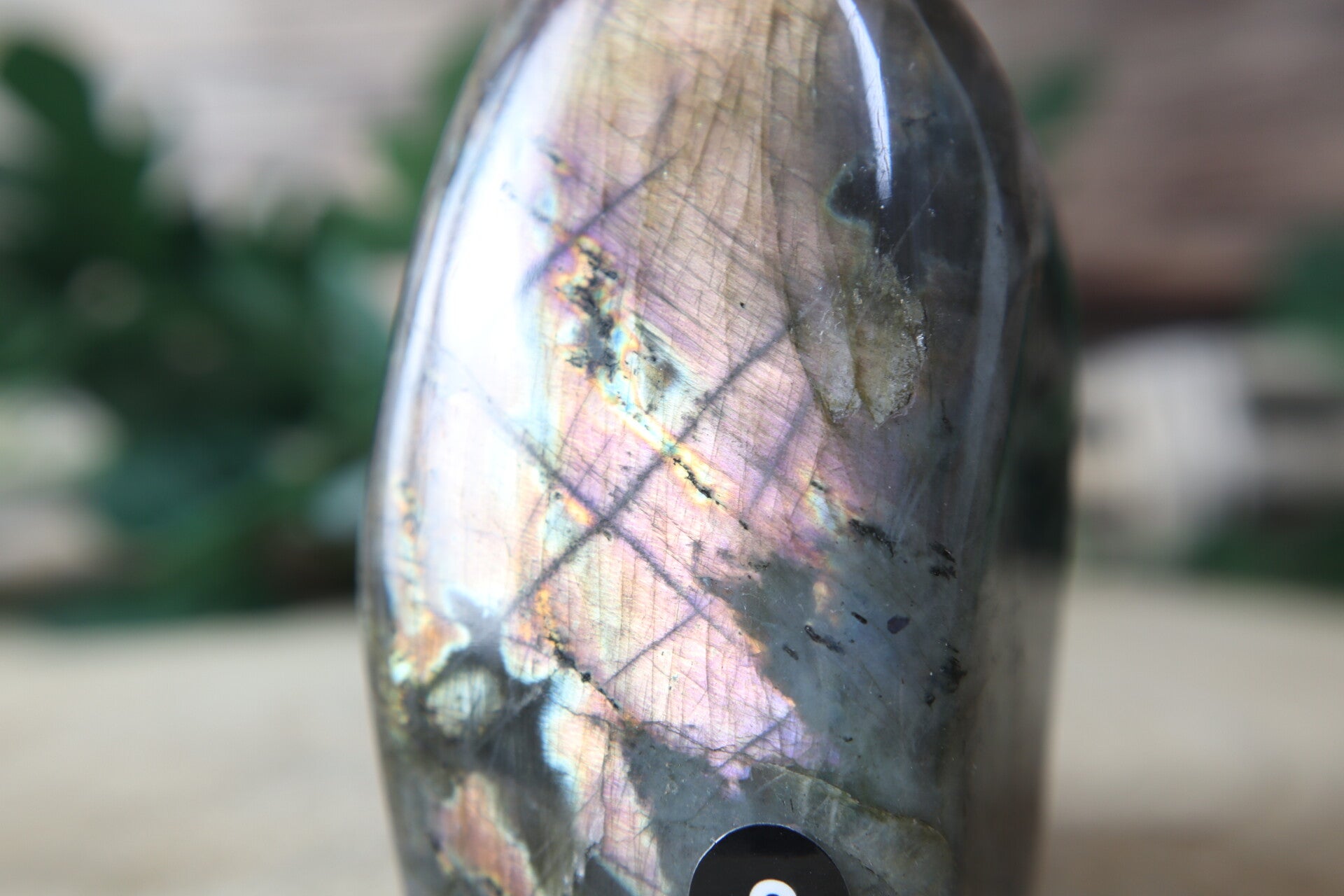 Laat je betoveren door de warme gloed van deze prachtige labradoriet sculptuur uit Madagaskar. De steen toont een schitterende oranje-roze flash wanneer het licht erop valt, wat dit stuk extra bijzonder maakt. Een unieke toevoeging aan je edelstenenverzameling of een krachtig spiritueel object voor in je ruimte.