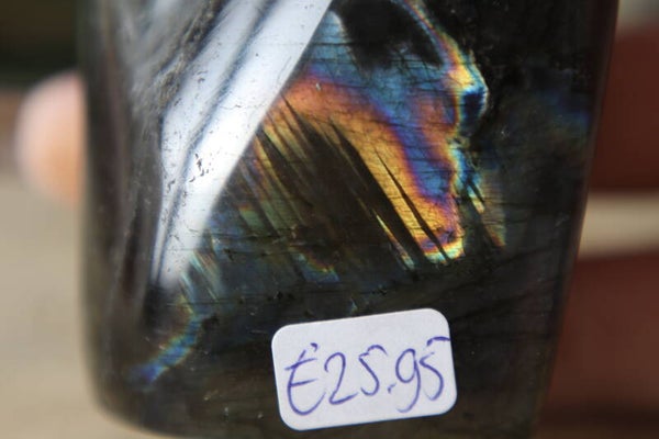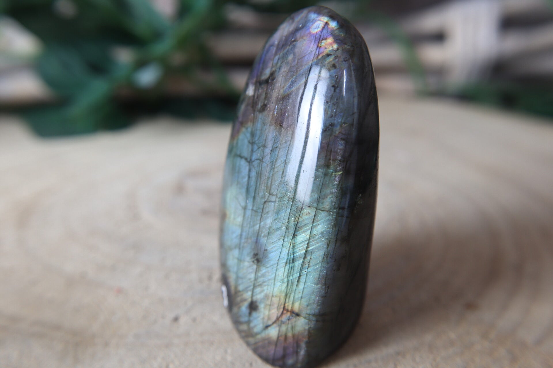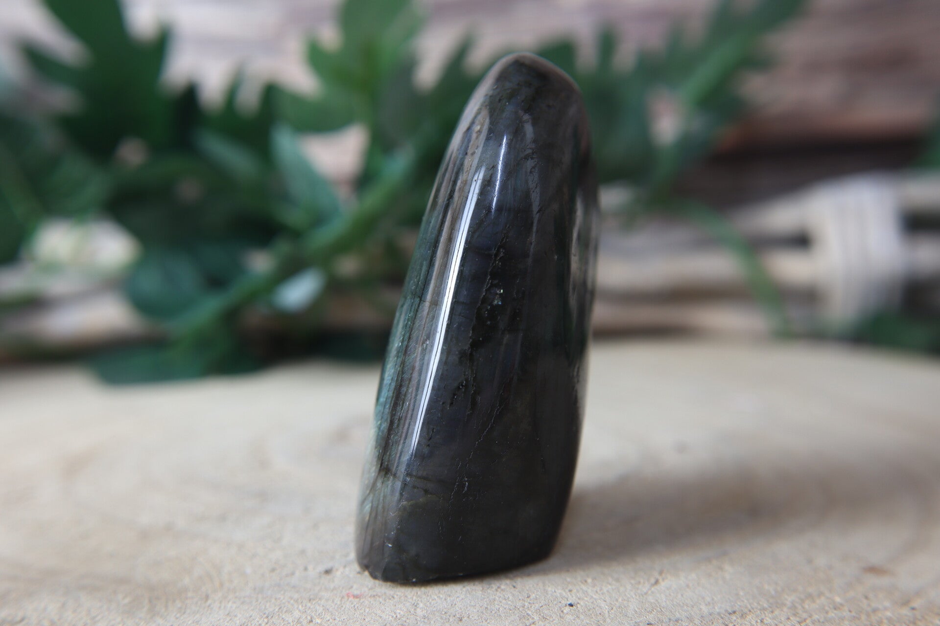 Deze prachtige labradoriet sculptuur straalt met een betoverende groene flash. Met een formaat van ongeveer 8 x 4 x 3 cm en een gewicht van 193 gram is dit een compact, maar opvallend stuk dat zowel decoratief als energetisch waardevol is.