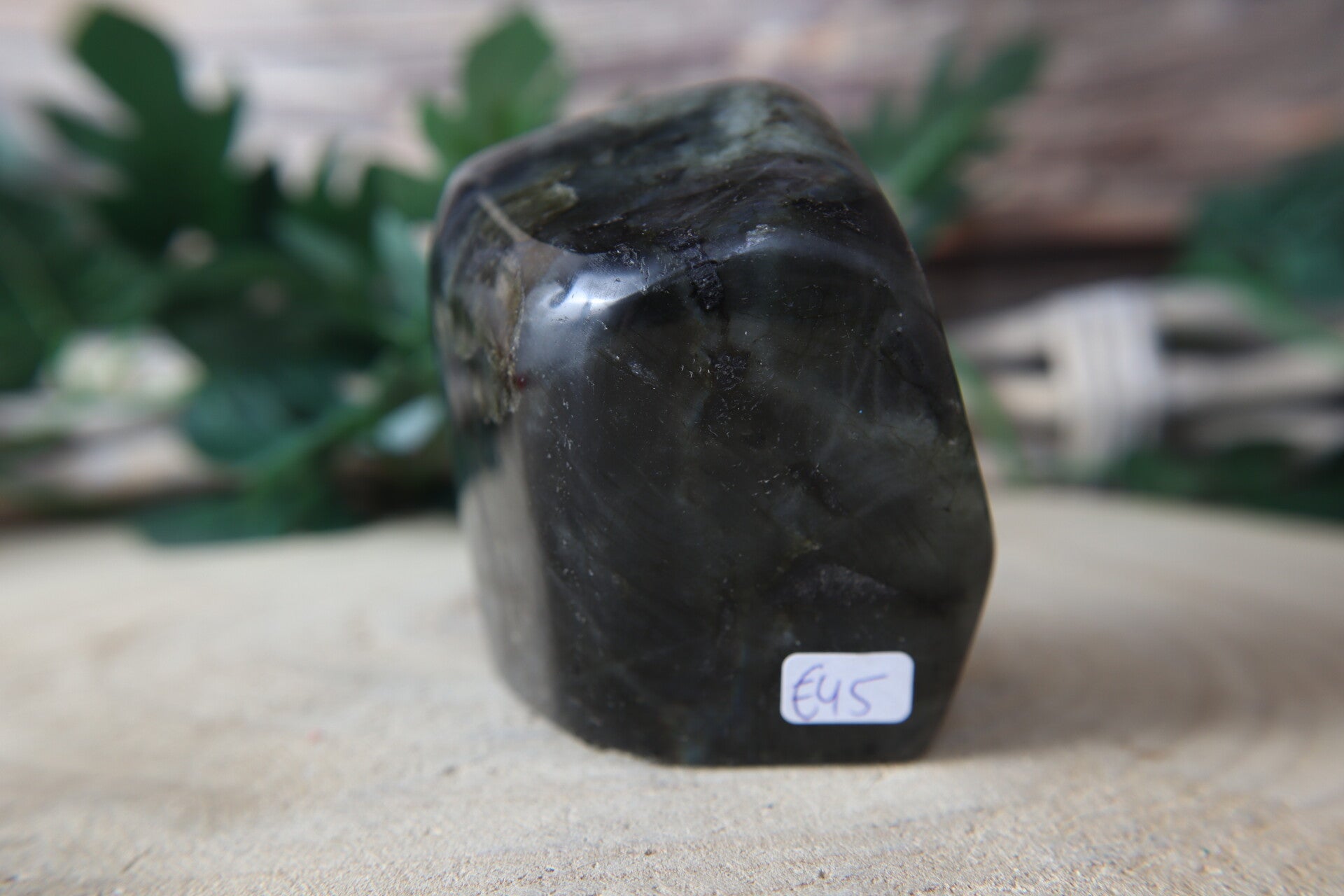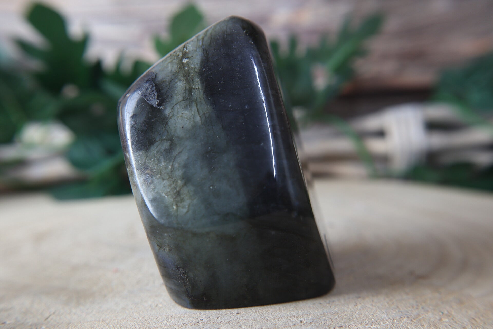Een uniek stuk labradoriet met een prachtige paarse en oranje flash. Deze sculptuur meet ongeveer 8 x 6 x 4 cm en weegt 385 gram. Let op: aan de onderkant aan de achterkant is een kleine beschadiging aanwezig – dit doet niets af aan de krachtige uitstraling en werking van de steen.