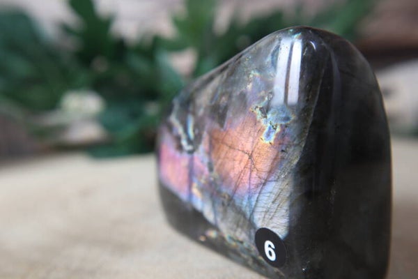 Laat je betoveren door de unieke kleuren van deze labradoriet sculptuur, met een opvallende oranje en roze flash. De steen heeft een afmeting van ongeveer 7 x 6 x 3,3 cm en weegt 347 gram. Een schitterend natuurproduct dat niet alleen visueel intrigeert, maar ook krachtige energetische eigenschappen bezit.