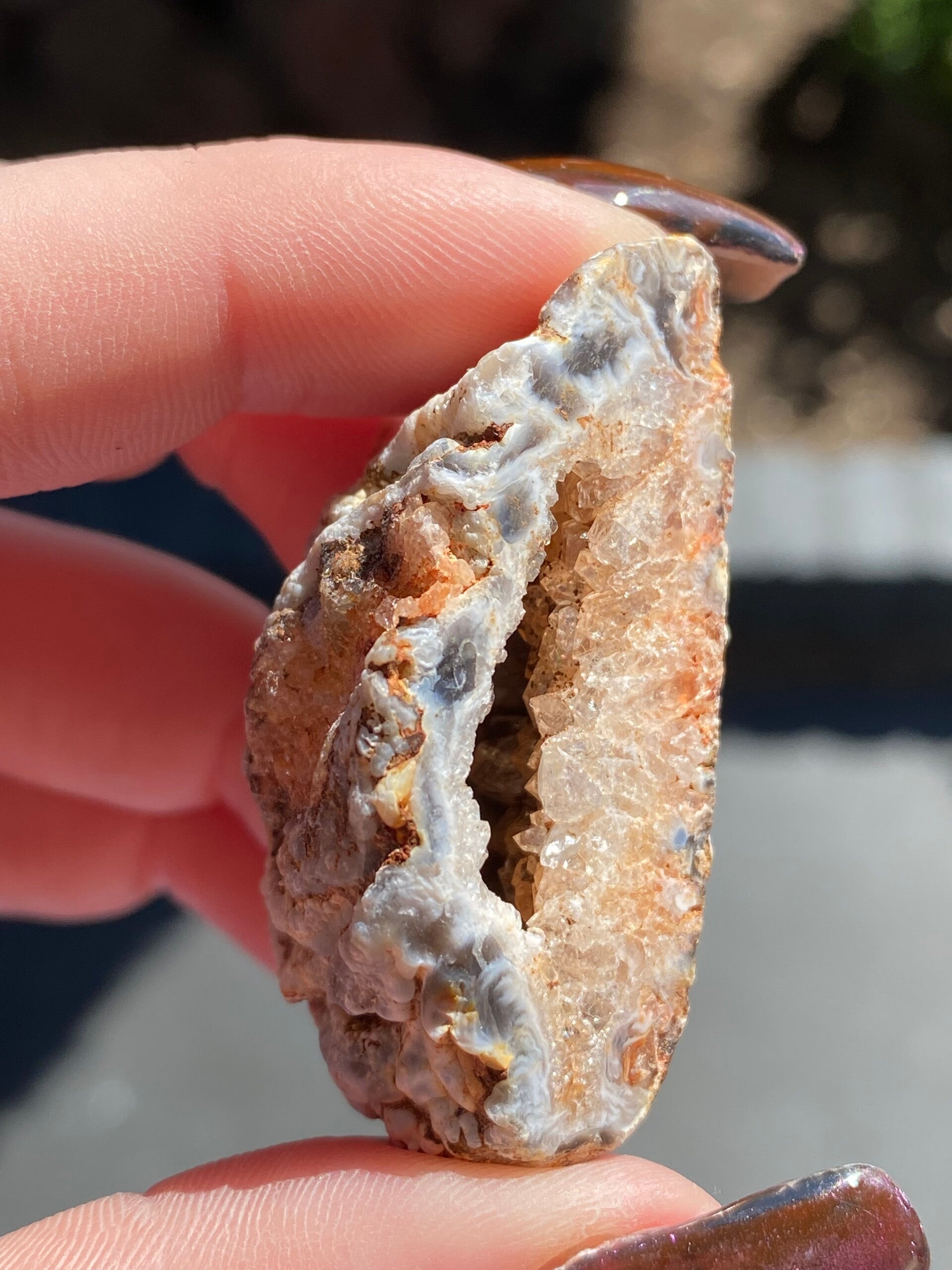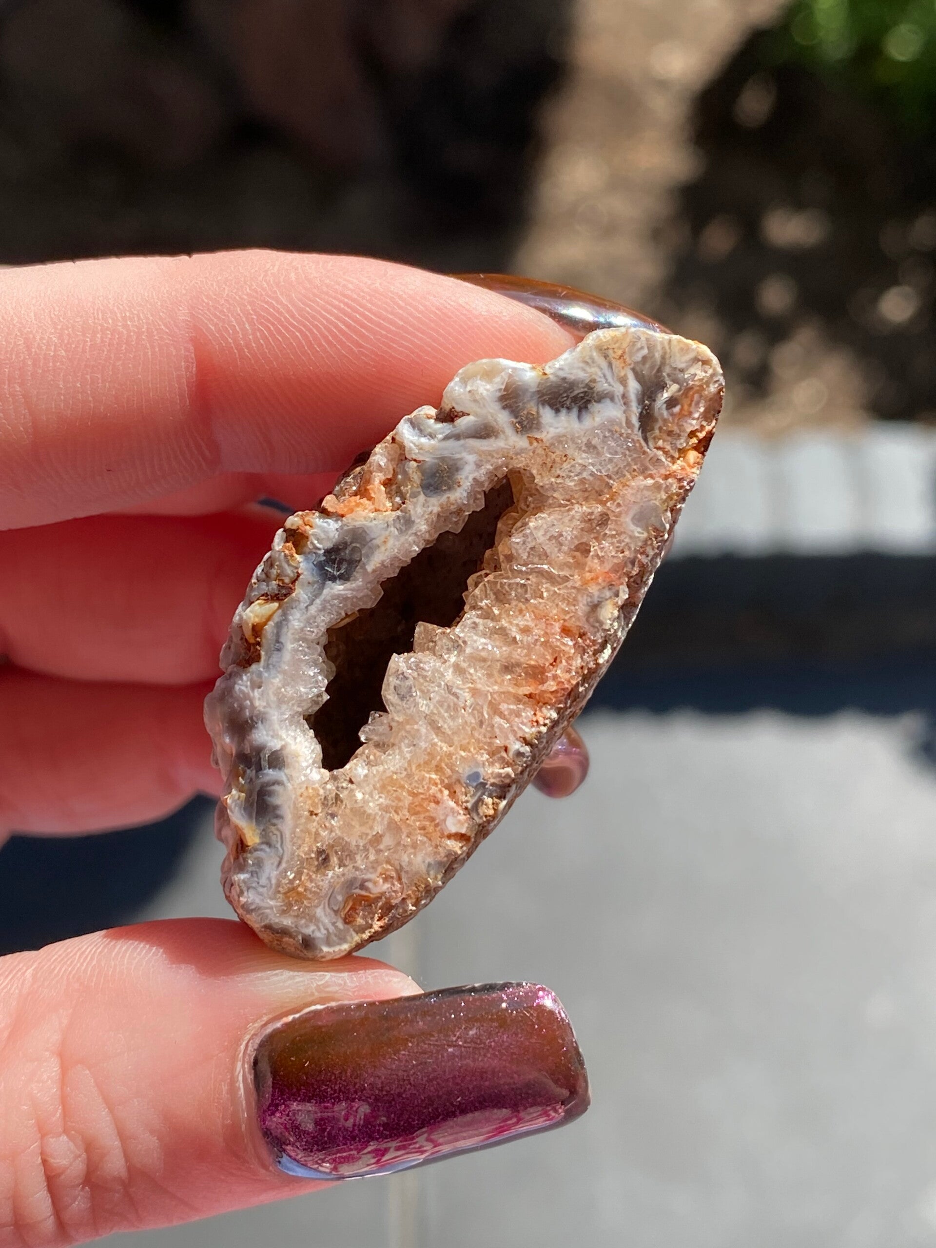 Agaat geode 3. Afmetingen (±) 4,5x2x2,2cm. Gewicht: 25gr.