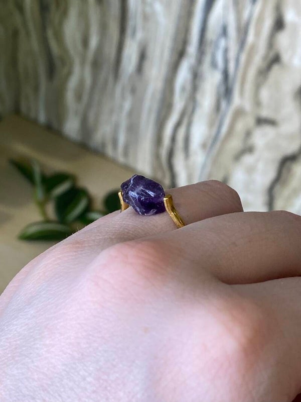 De Ring Ruw Amethist Goud – Maat 18,5 is een verfijnde en elegante ring die de schoonheid van de natuur combineert met een luxe uitstraling. De ring bevat een ruwe amethist edelsteen in een prachtige, onbewerkte vorm, waardoor elke ring uniek is. De gouden afwerking zorgt voor een warme en tijdloze uitstraling die perfect past bij zowel casual als formele outfits.