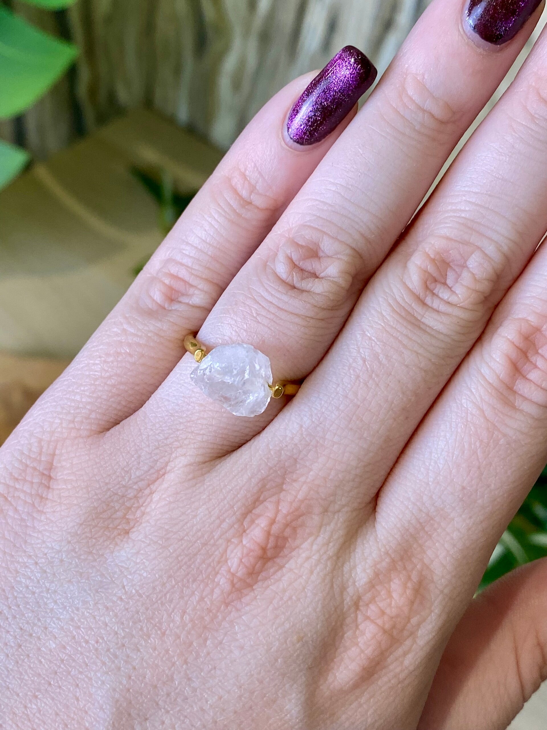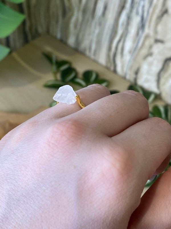Bergkristal staat bekend om zijn krachtige, zuiverende eigenschappen en wordt vaak geassocieerd met helderheid en balans. De ruwe afwerking van de steen zorgt ervoor dat elke ring uniek is, waardoor geen twee exemplaren precies hetzelfde zijn. De gouden band voegt een extra laag luxe toe, terwijl het hoogwaardige dq metaal van de ring zorgt voor een langdurige kwaliteit. Het is bovendien 100% nikkelvrij, waardoor de ring geschikt is voor mensen met een gevoelige huid.