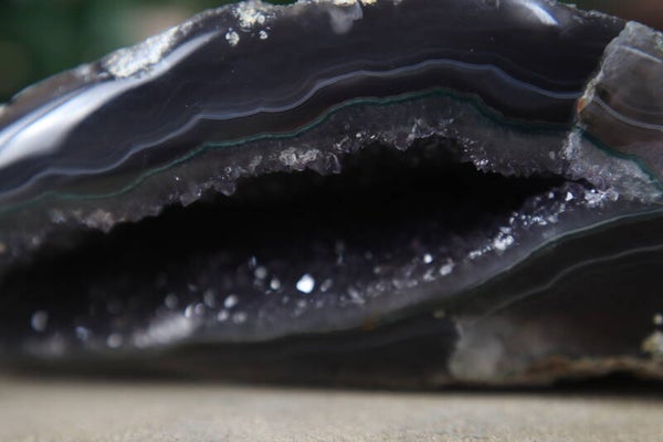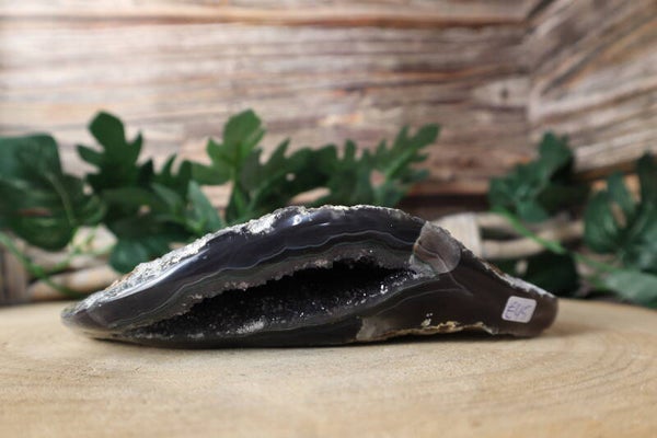 Deze prachtige agaat geode is een echt uniek natuurkunstwerk, met een schitterende druzy binnenkant. De combinatie van de stevige, aardse agaatstructuur en de sprankelende druzy zorgt voor een fascinerend contrast dat elke ruimte verrijkt.