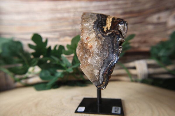 Deze indrukwekkende agaat op standaard is een echte eyecatcher. Het natuurlijke agaatpatroon is prachtig zichtbaar en bevat een schitterend druzy gedeelte – een met fijne kristallen bezette binnenzijde die subtiel glinstert bij het licht.