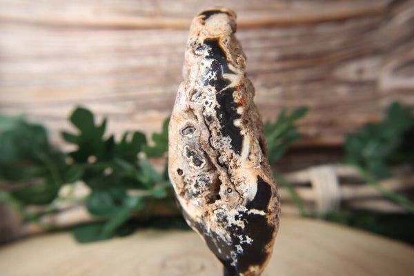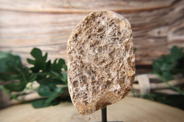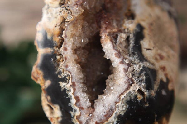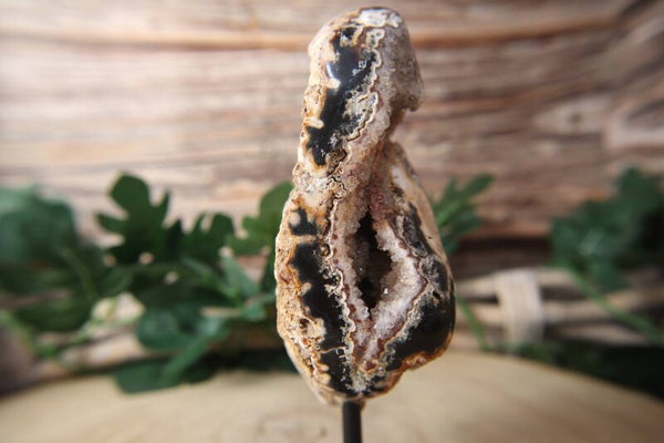 Deze indrukwekkende agaat op standaard is een echte eyecatcher. Het natuurlijke agaatpatroon is prachtig zichtbaar en bevat een schitterend druzy gedeelte – een met fijne kristallen bezette binnenzijde die subtiel glinstert bij het licht.