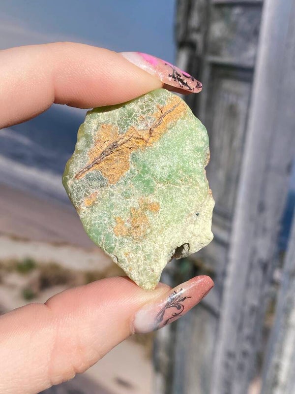 Dit ruwe Chrysopraas stukje heeft een prachtige natuurlijke groene tint en een onbewerkte structuur. Perfect voor kristalverzamelaars, edelsteenheling of als klein decoratief mineraal.
