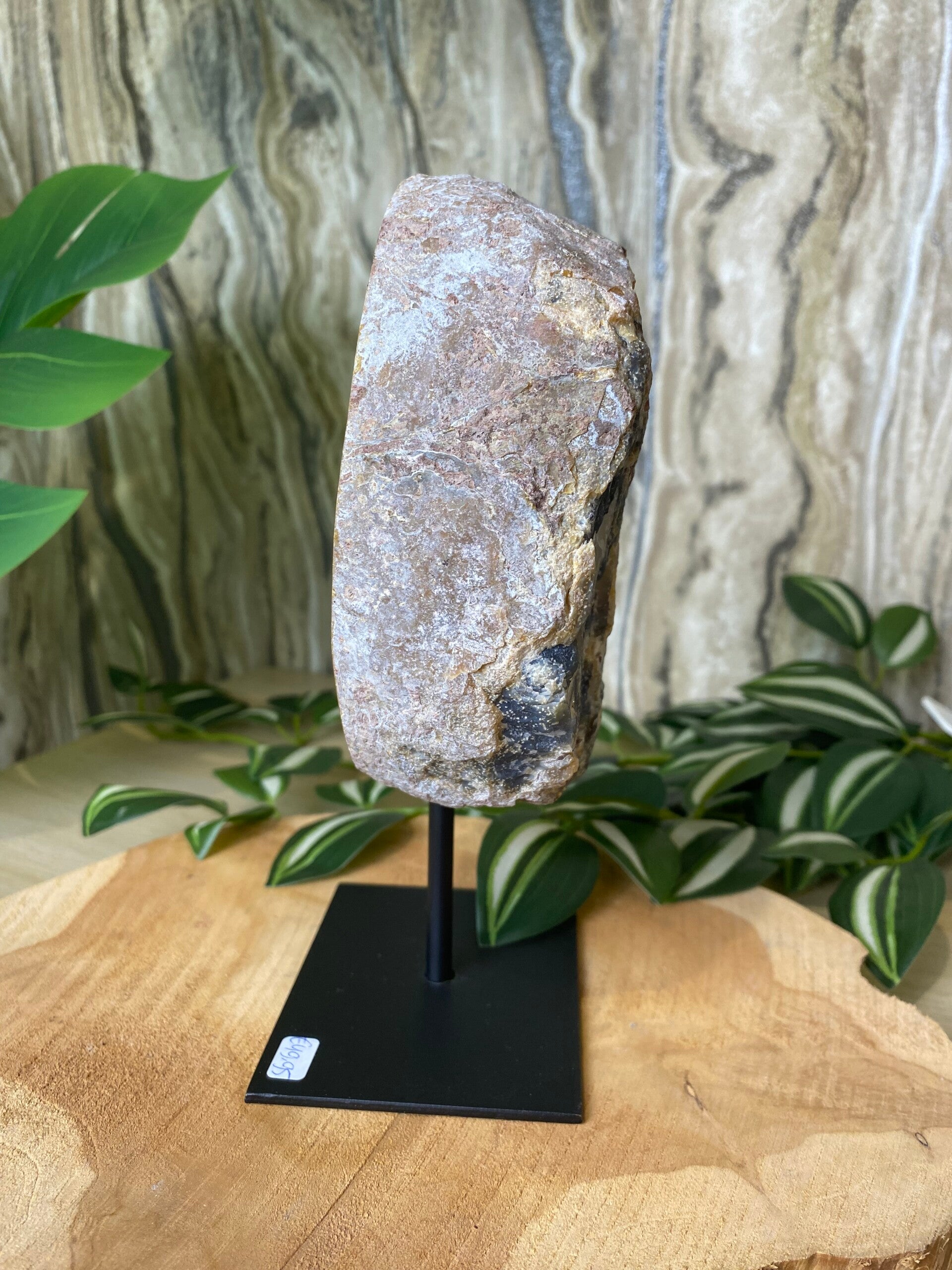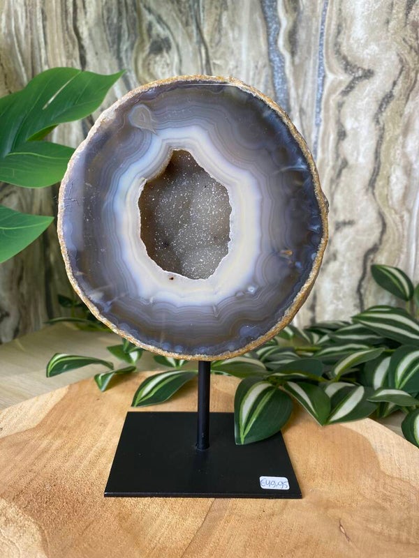 Deze unieke Agaat op standaard is een waar natuurkunstwerk met een gewicht van 1400 gram en een totale hoogte van 19 cm inclusief standaard. Het stuk heeft prachtige natuurlijke patronen die elke agaat uniek maken.