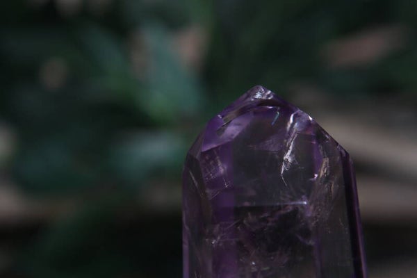 Deze phantom toren straalt verfijnde schoonheid uit. Het kristal is helder met een zachte paarse tint, rijk aan intrigerende insluitingen en sprankelende regenboogjes die tevoorschijn komen bij het juiste licht. Met een hoogte van 6 cm en gewicht van 85 gram is dit een compact en toch opvallend stuk dat iedere kristalverzameling verrijkt.