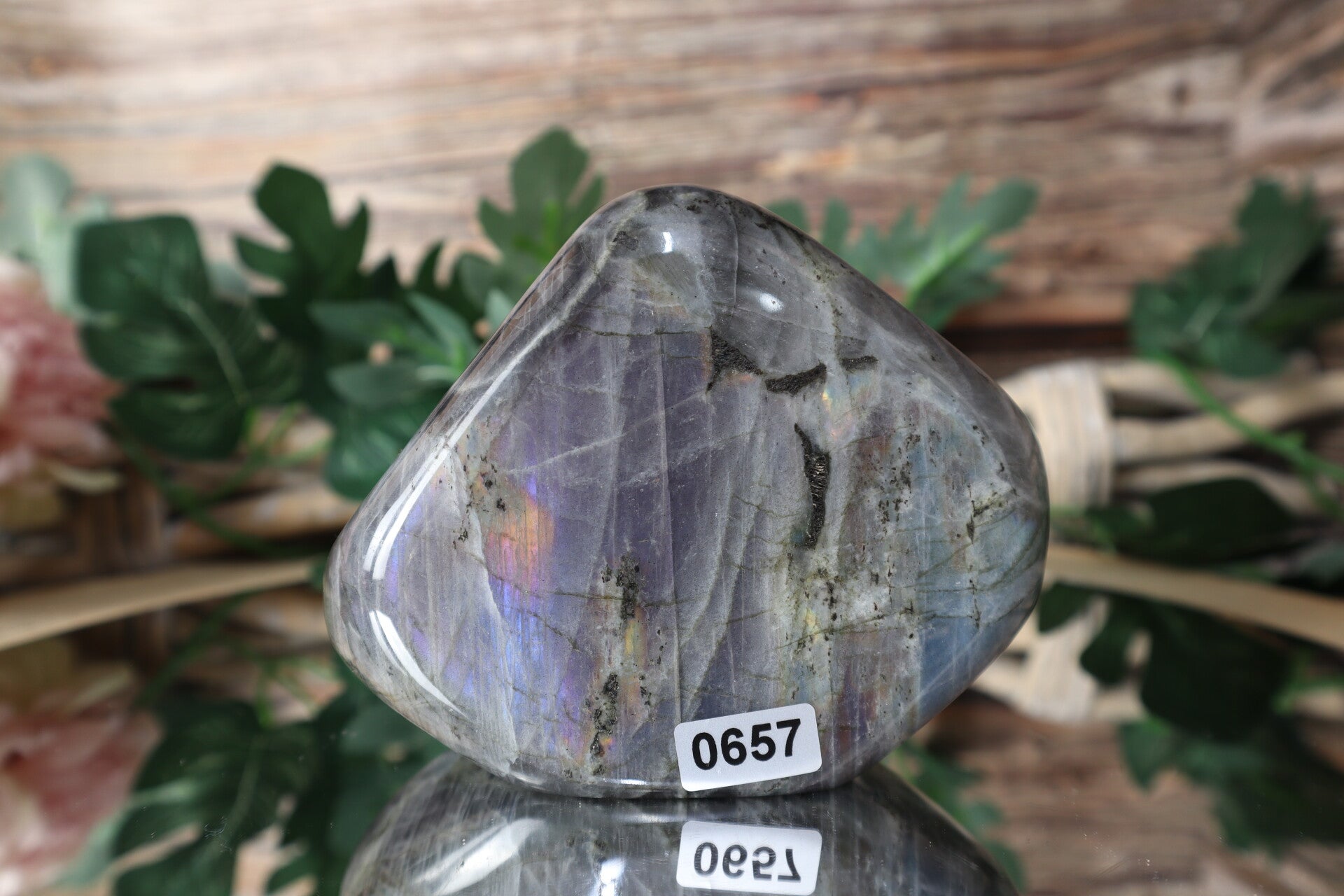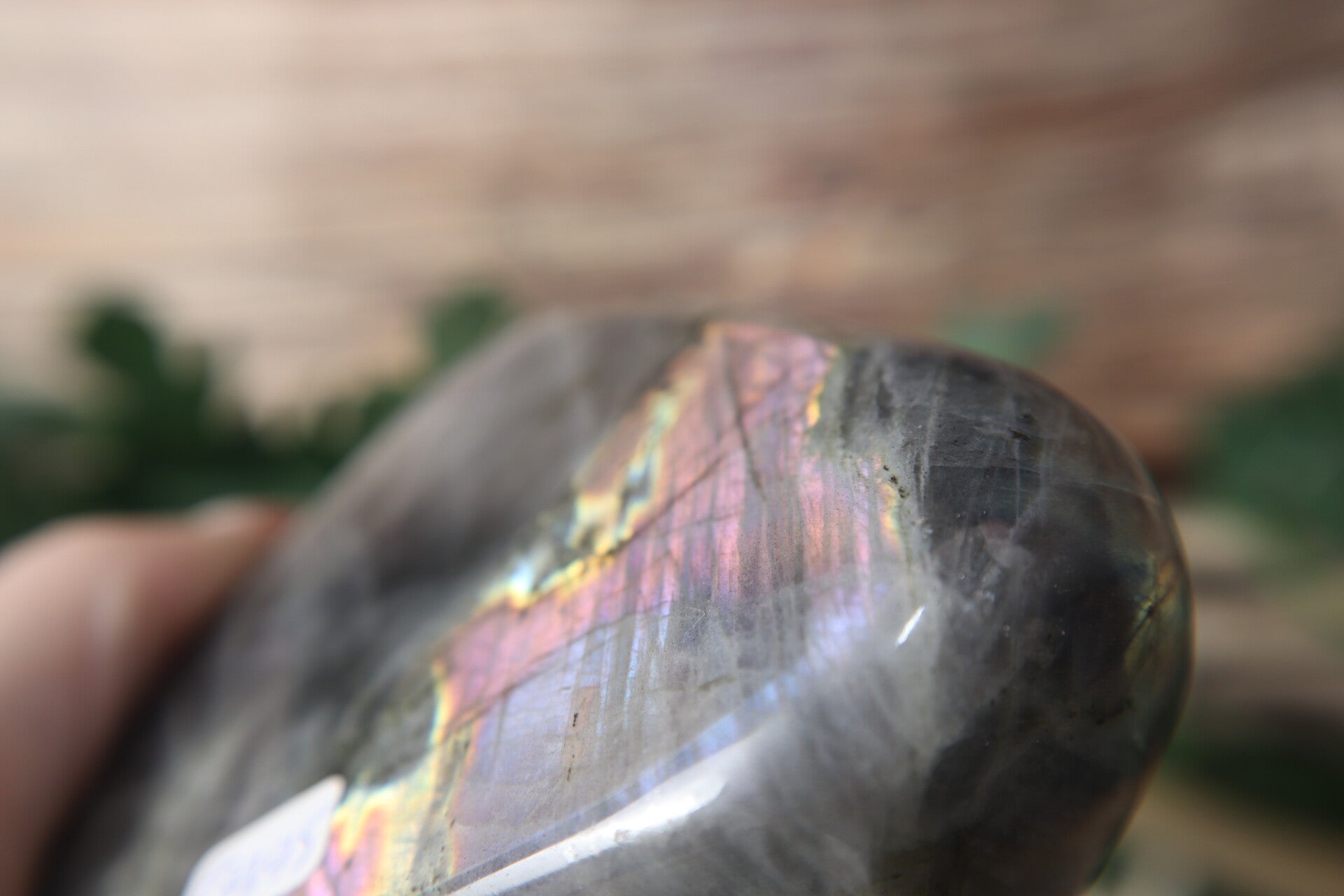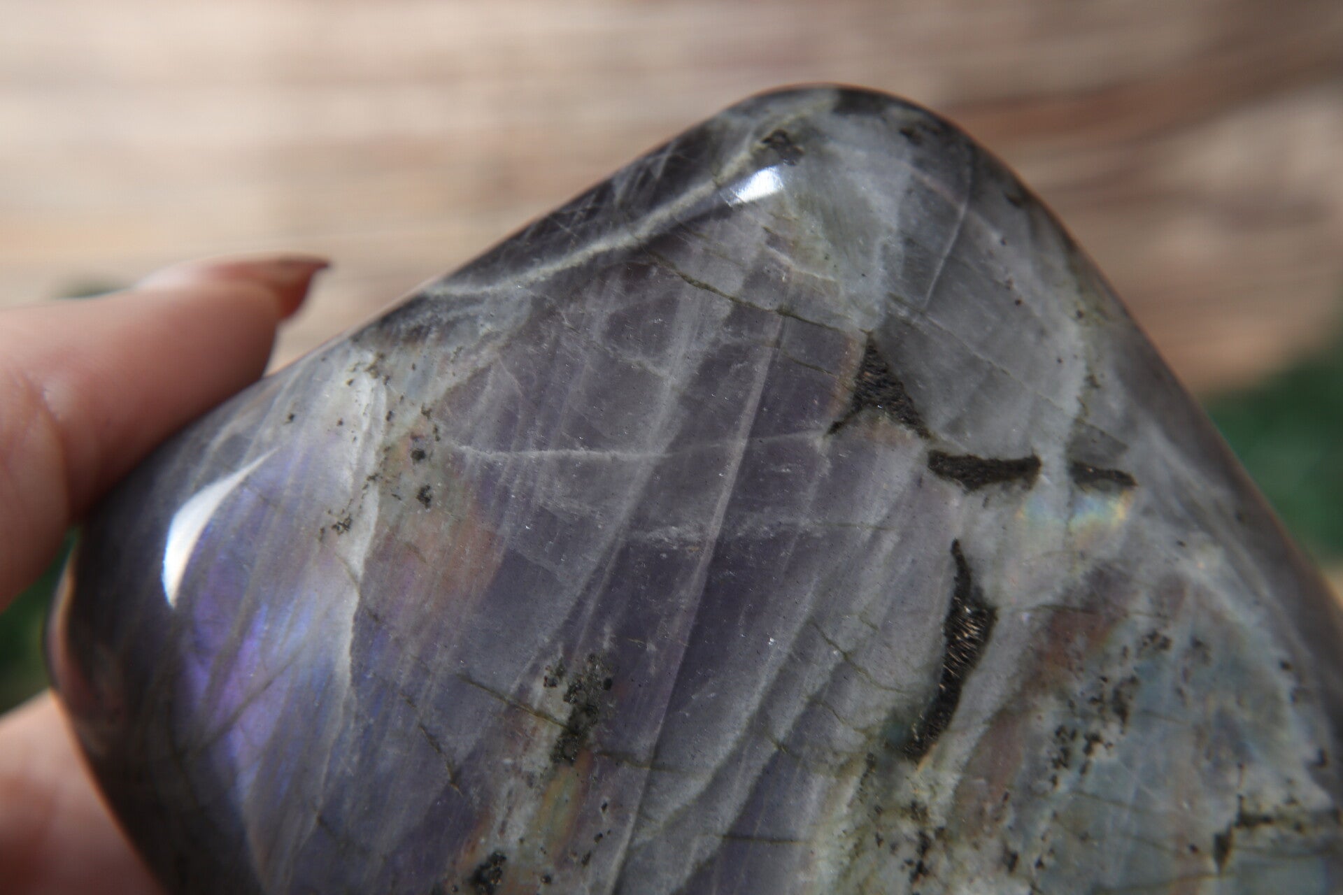 Deze grote labradoriet freeform is een waar kunstwerk van de natuur. Het gepolijste oppervlak onthult een betoverend kleurenspel met blauwe, paarse en oranje flash die oplichten zodra het licht erover valt. Door zijn formaat en levendige kleuren is dit stuk een indrukwekkende blikvanger in je interieur of edelsteenverzameling.