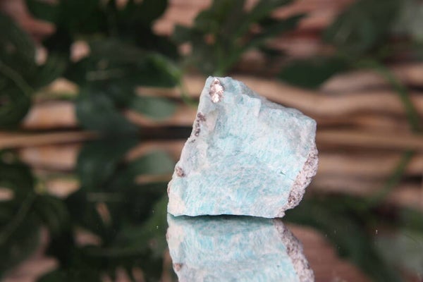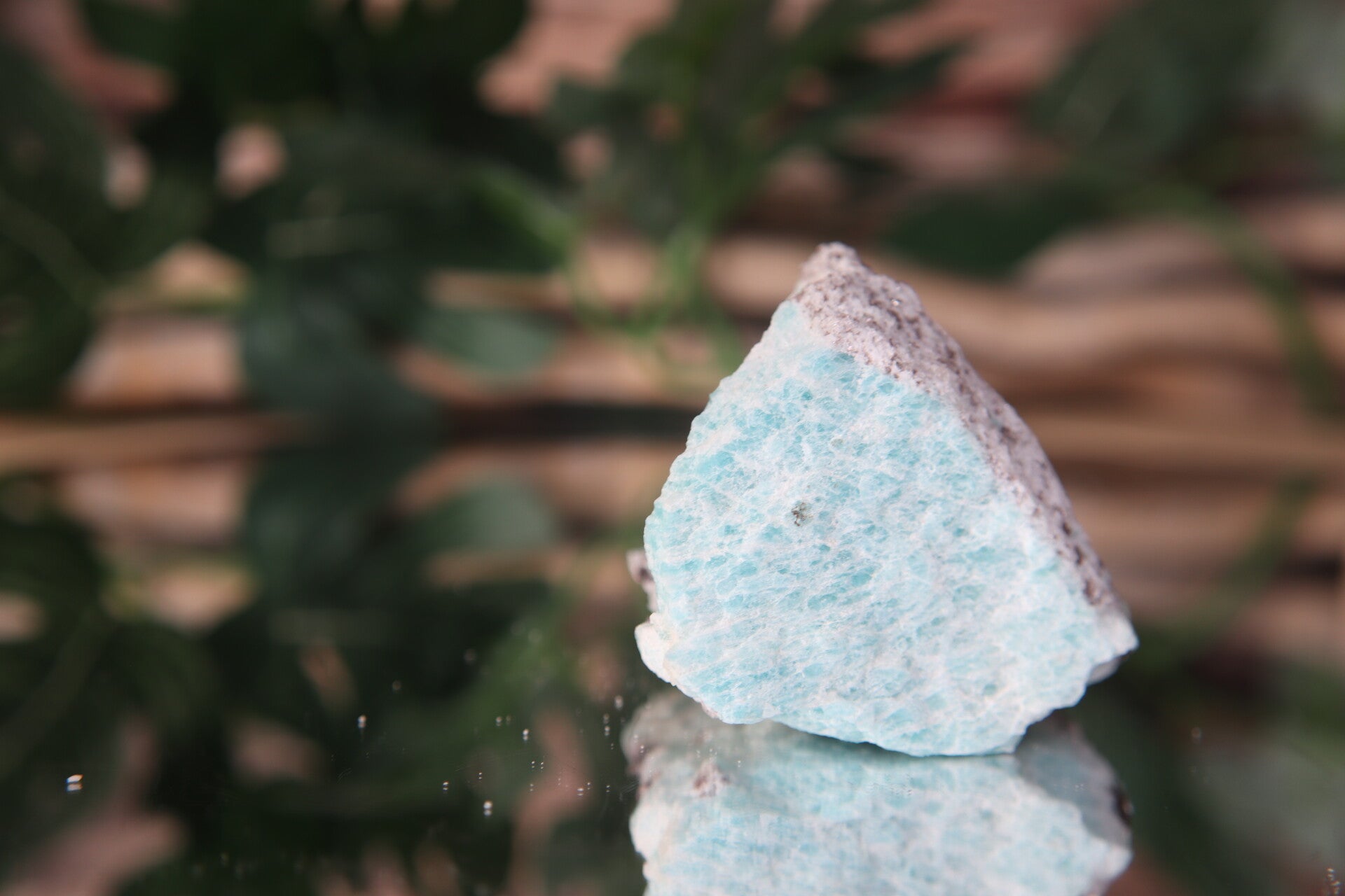 Dit prachtige ruwe stuk amazoniet valt direct op door zijn diepe turquoise kleur. De natuurlijke aanwezigheid van mica zorgt voor een subtiele glinstering, wat het stuk extra karakter en diepte geeft. Een krachtig en puur natuurproduct voor liefhebbers van bijzondere mineralen.