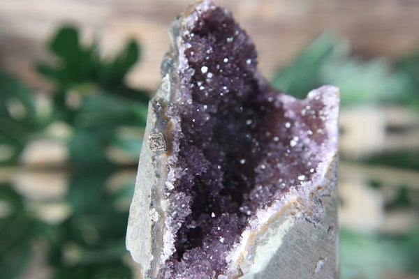 Deze prachtige amethist met cut base is aan de onderzijde vlak geslepen, waardoor het stuk stevig rechtop kan staan. De natuurlijke kristallen en diepe paarse tinten maken dit een sfeervol en krachtig decoratief object.